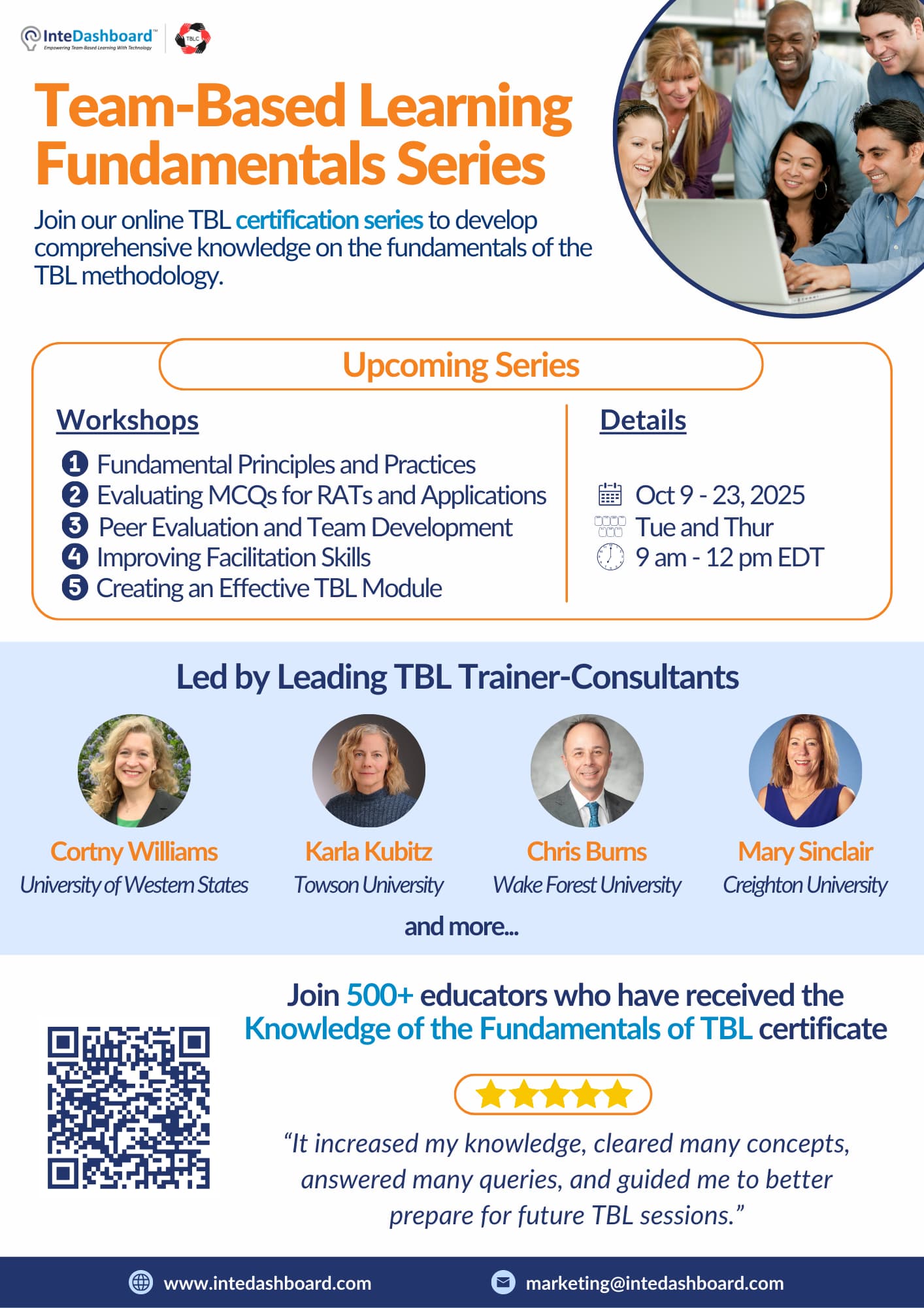 We have a flyer below for you to easily share the TBL Fundamentals Series with your faculty members. Discounts of 10%-25% are available for groups of five and above. For more information, you can reach out to us at marketing@intedashboard.com. Looking forward to having you and your colleagues with us!